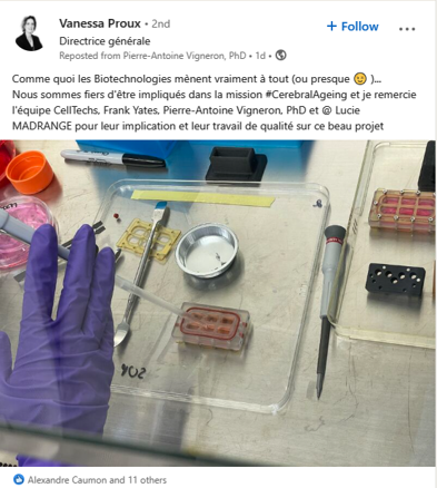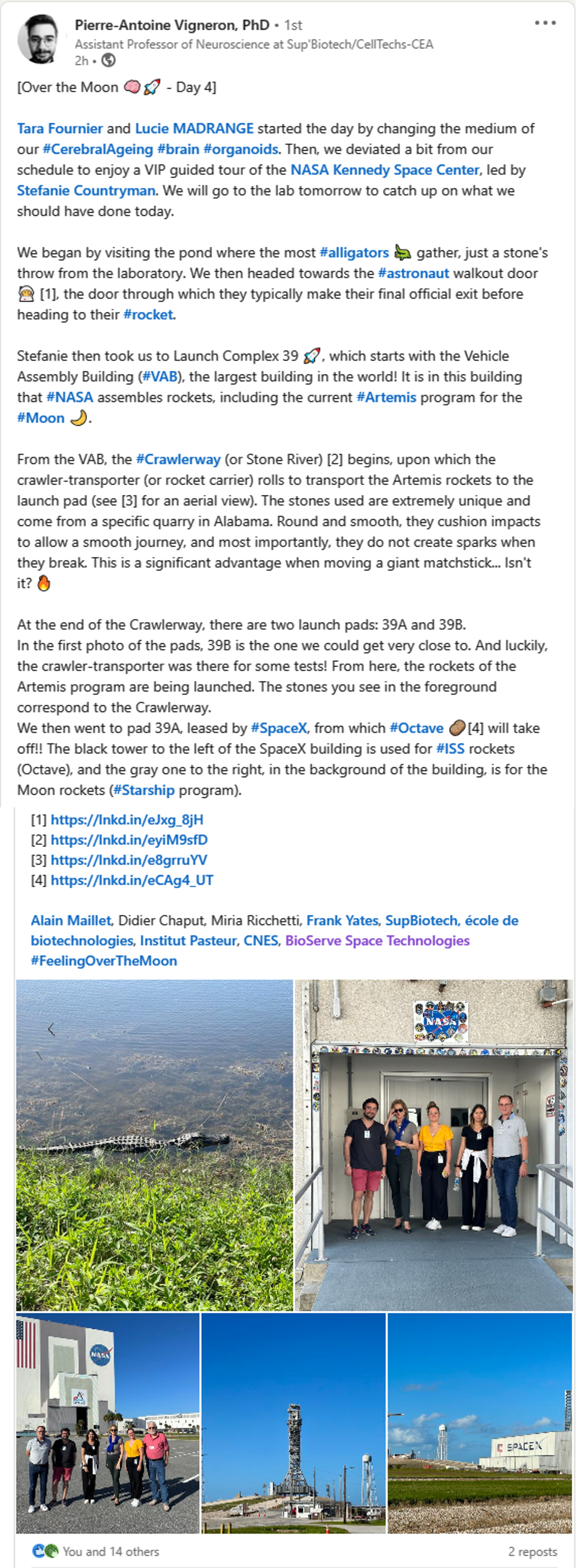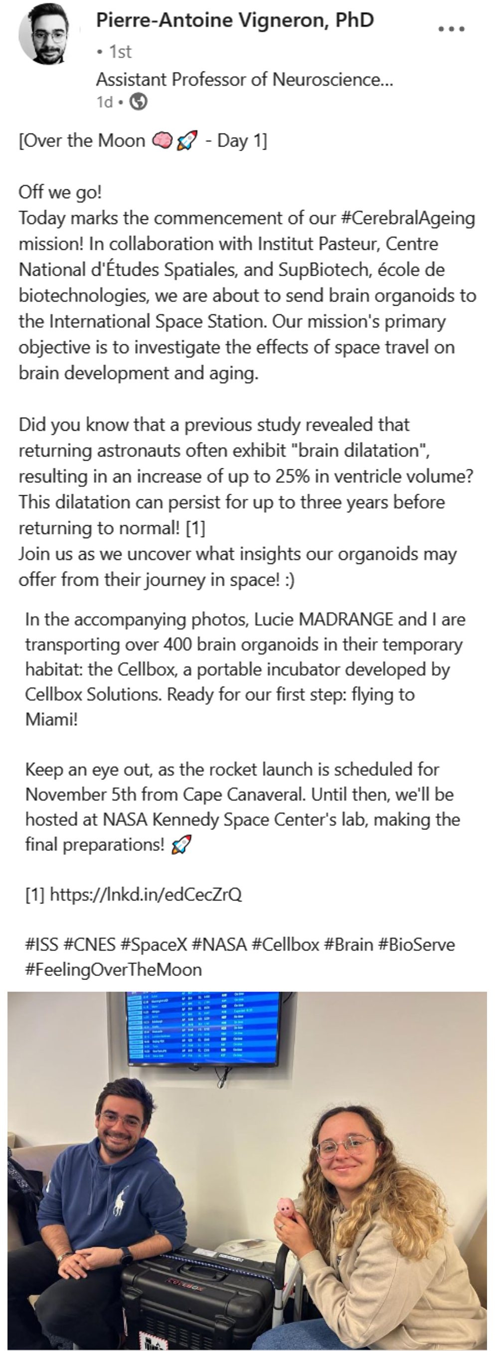 The Cerebral Ageing team, composed of members of the CellTechs (SupBiotech/CEA) laboratory, the Pasteur Institute, the CNES and Bioserve Space Technologies were present two weeks before the Spx-29 launch to prepare the organoids for the flight.